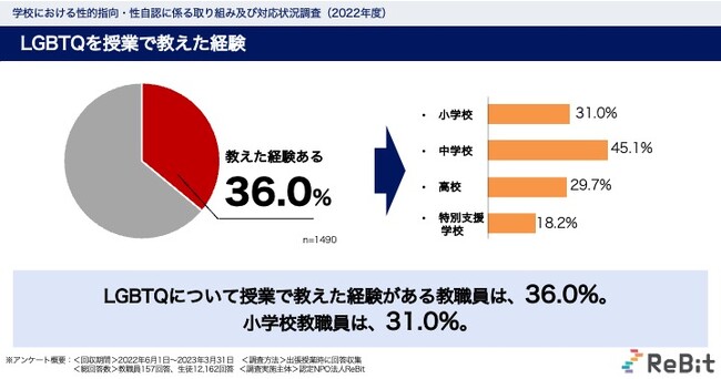 本調査は、学校における性的指向・性自認に係る取り組み及び対応状況を明らかにすることで、全ての学校がLGBTQの子どもにとっても、安心・安全な環境になることを目指し、認定NPO法人ReBit(以下、ReBit)が実施しました。本調査は、2022年6月1日(水)~2023年3月31日(金)に、ReBitが実施した出張授業先の学校や行政等のうち同意を頂いた機関にて、教職員と生徒(小学校高学年~大学)を対象とした調査を実施しました。