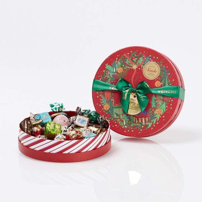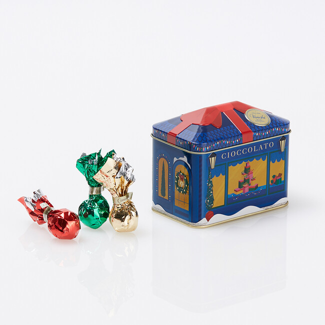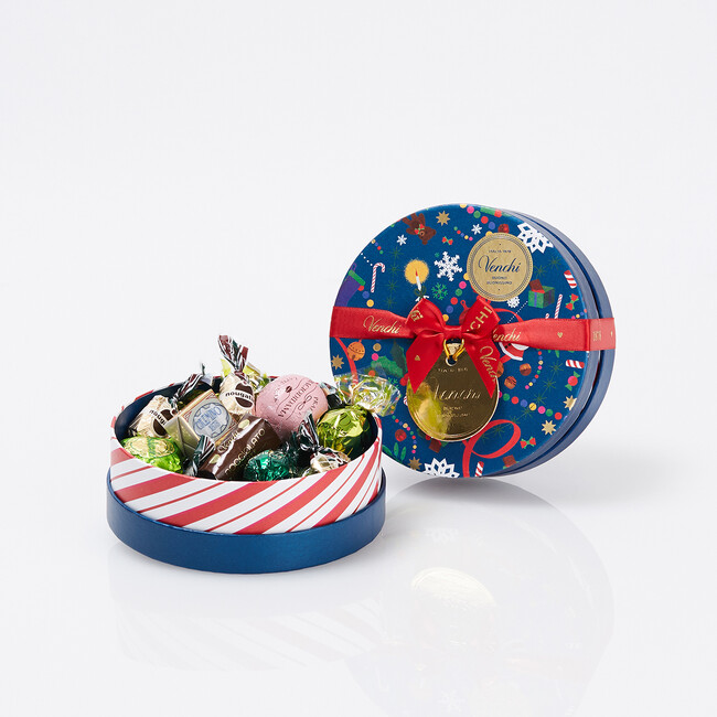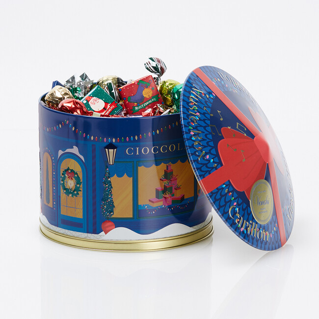 オルゴール付きの大きなギフト缶。底面を回してねじを巻きテーブルに置けば、クリスマスソングが流れ、ヴェンキのショップの様子が描かれた缶が回転します。チョコレート11種入りの豪華なギフト缶。