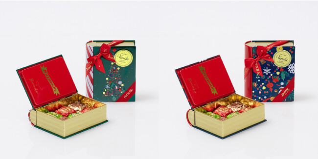 クリスマスの物語が詰まった小さなブック缶。キャンディーケインをイメージした背表紙に表は深緑が印象的なクリスマスツリーのデザインと、真っ赤な背表紙に表はサンタクロースやプレゼントが散りばめられた2種類のデザイン。チョコビア3種がアソートされています。