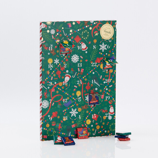 本の形をした豪華なアドベントカレンダー。美しいリースがデザインされた表紙を開けると25個の引き出しに13種類のチョコレートが隠れています。引き出しの向きを変えることで、4種類のデザインが楽しめます。