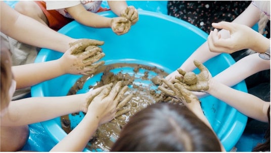 まず泥の特徴、面白さを知ってもらうことを目的に、瓦や美容など私たちの生活に役立っている泥について解説。実際にヘアケアなど「DROAS」のビューティケア商品に使われている様々な種類の泥を、子どもたちに“見たり・嗅いだり・触ったり”と五感を使って観察してもらったところ「つるつるしていて気持ちいい」「意外とサラサラ」などの声があがっていました。