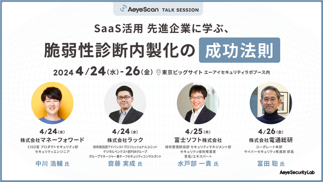 株式会社エーアイセキュリティラボ(https://www.aeyesec.jp/ 東京都千代田区 代表取締役社長:青木 歩 以下、エーアイセキュリティラボ)は、4月24日(水)~26日(金)に東京ビッグサイトで行われる「情報セキュリティEXPO【春】」にて、当社が提供するSaaS型Webアプリケーション脆弱性診断ツール「AeyeScan」導入企業との公開対談「SaaS活用 先進企業に学ぶ、脆弱性診断内製化の成功法則」を実施いたします。
