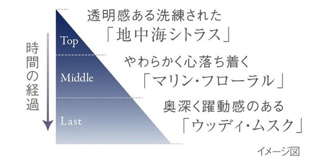 透明感のあるフレッシュなシトラスの香りに、微かなムスクが奥深い余韻を残します。纏うだけで、清潔感と好印象を引き寄せ、自分らしさと自信をさりげなく演出します。
