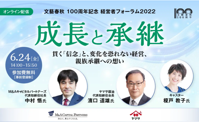 M&Aキャピタルパートナーズ株式会社(東京都千代田区・代表取締役社長 中村悟)は、当社が協賛する「文藝春秋 100周年記念 経営者フォーラム(主催:文藝春秋、協賛:M&Aキャピタルパートナーズ株式会社)」を、本日2022年6月24日(金)14:00~15:50に開催いたします。
