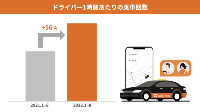 また、「DiDi」導入ドライバー1時間あたりの乗車回数についても、2022年1月~8月で前年同期比+56%と増加しています。同時に、2台目として「DiDi」を導入し複数のアプリを併用する事業者様も含め、DiDiを新規でご利用いただくタクシー事業者様も増えてきています。利用者だけではなく、供給側であるタクシー事業者様にもこうした価値提供ができており、配車プラットフォームとして着実に成長を遂げています。