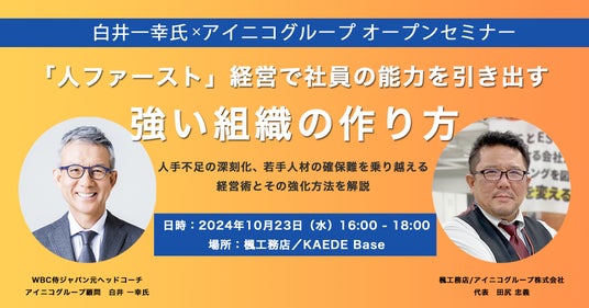 「笑顔を創造し続ける」を企業理念とするアイニコグループ株式会社(旧社名:株式会社楓工務店、代表者:田尻 忠義、所在地:奈良県奈良市)は、WBC侍ジャパン元ヘッドコーチであり、同社顧問を務める白井一幸氏と、2024年10月23日(水)に「人ファースト」経営で社員の能力を引き出す「強い組織の作り方」オープンセミナーを開催いたします。