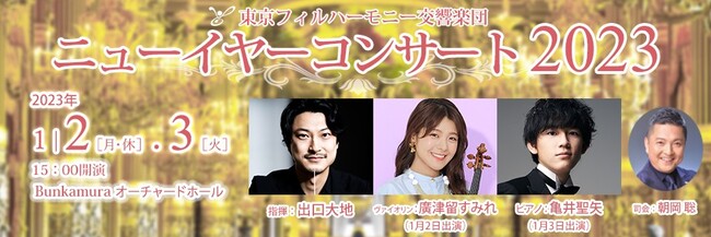 公益財団法人東京フィルハーモニー交響楽団(以下、東京フィル/所在地:東京都新宿区、理事長:三木谷浩史)では、2023年1月2日(月・休)・3日(火)の2日間、毎年恒例の「ニューイヤーコンサート」(共催:Bunkamura)を開催します。