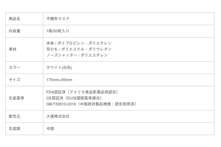 大運 株式会社(本社所在地:埼玉県川口市 代表取締役:王 景国)は、高品質不織布マスクを安価でより多くの方にご使用いただくため、業界最安値水準の1箱(50枚)360円で12月5日より販売を開始致します。各国の品質基準をクリアし、証明書を取得した工場で品質・衛生管理を徹底しているため、安全にご利用いただけます。また、薬局・医療機関・企業に大量納品の実績がありますので、安心してご利用いただけます。コロナ禍のなか、経済活動との両立に少しでも貢献できましたら、嬉しく思います。