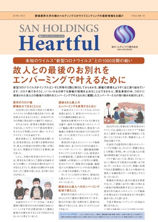 新型コロナウイルスがインフルエンザと同等の5類に移行してから4か月あまりが経ちます。コロナで激変した世の中ですが、いついかなる時でも葬儀の現場を止めることはできません。今回の『燦ホールディングスHeartful Vol.10』では、緊急事態の中でもコロナに感染された故人との最後のお別れをエンバーミングで叶えるために奮闘したエンバーマーたちの取り組みを紹介します。