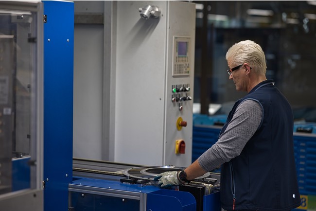 ドイツ・ゾーリンゲンの工場内では、製造機器や、鉄を引く研削盤、組立機械など、すべて自社のチームによって