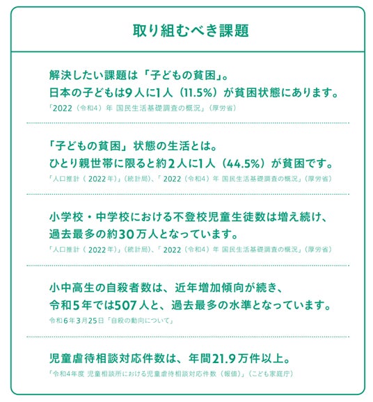 「子どもの貧困に、本質的解決を。」をミッションに掲げ、困難を抱える子どもたちへ学習支援と居場所づくりを展開しています。設立から延べ11,800人の子どもたちに支援を届けてきました。そして、地域の様々なステークホルダーと協力をしながら「つながり」「学びの環境」「育まれる環境」を整備し、6歳から18歳の子どもたちの生活圏に必要なすべての支援・機会がそろう「地域協働型子ども包括支援」のモデル構築。本モデルを全国へ広げ、すべての子どもたちが自分の可能性を信じ、 自分の力で人生を切り拓くことのできる社会の実現を目指しています。