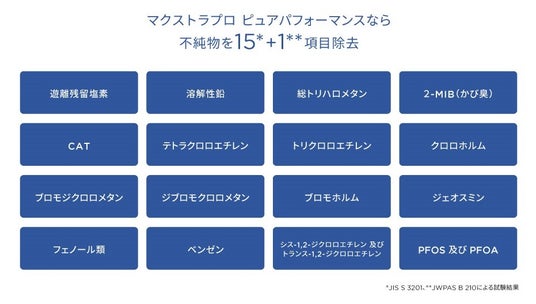 - 除去物質:<JIS S 3201試験結果>遊離残留塩素、溶解性鉛、総トリハロメタン、2-MIB(かび臭)、CAT、テトラクロロエチレン、トリクロロエチレン、クロロホルム、ブロモジクロロメタン、ジブロモクロロメタン、ブロモホルム、ジェオスミン、フェノール類、ベンゼン、シスー1,2-ジクロロエチレン及びトランス-1,2-ジクロロエチレン<ドイツ本国除去性能試験>銅、水アカ、除草剤、農薬、医薬品など特定の微量不純物