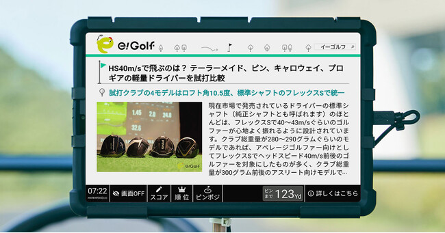 e!Golfでは「すでにゴルフが好きな人にも、これから好きになる人にも、楽しくて役に立つゴルフ情報」が発信されます。画面下にある「詳しくはこちら」ボタンをタップした後に表示されるQRコードをスキャンいただくと、e!Golf のサイトに遷移し、掲載記事の続きを読むことが可能です。Golfcart Vision(R)︎を通じて、ゴルフプレーの移動中もお楽しみいただけるコンテンツをお届けします。