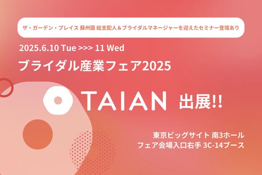 ブライダル・バンケットビジネスに特化したサービスやソフトウェアを提供する株式会社TAIAN(本社:東京都新宿区、代表取締役:村田 磨理子、以下「TAIAN」)は、2025年6月10日・11日に開催される株式会社ブライダル産業新聞社主催『ブライダル産業フェア2025』に出展することをお知らせいたします。