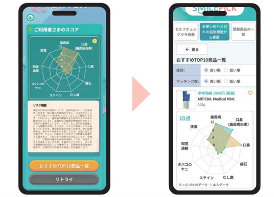 スマートフォン画面 口腔リスクからオススメ歯みがき粉を表示