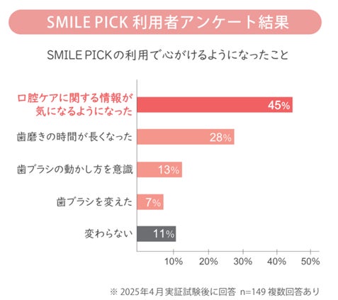 口腔ケアに対する意識や考え方の調査※2によると、「歯は日頃からのケアが大事」という項目に対して87%の人が賛同している一方、実践が続かず、働く世代では歯周病リスクが高止まりしています。行動定着に必要なのは、日常の中で続けられる仕組みです。アプリの公開前テストによると、SMILEPICKを利用していただいた方々が「自分の状態に合う一本」と出会うことにより、口腔ケアへの関心が高まり、行動変容のきっかけになったことを確認しました。