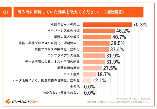 Q6.で「大きなギャップを感じる」「ややギャップを感じる」と回答した方に、「Q7.導入時に期待していた効果を教えてください。(複数回答)」(n=91)と質問したところ、「承認スピードの向上」が70.3%、「ペーパーレス化の推進」が46.2%、「業務の属人化解消」が40.7%という回答となりました。