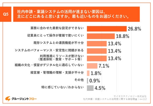 5. 社内申請・稟議システムの活用が進まない要因について、26.8%が「業務に合わせた柔軟な設定ができない」と回答