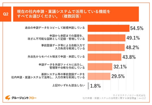 「Q2.現在の社内申請・稟議システムで活用している機能をすべてお選びください。(複数回答)」(n=112)と質問したところ、「過去の申請データをコピーして新規申請している」が54.5%、「申請から承認までの履歴を、改ざん不可能な証跡として記録・管理している」が49.1%、「事前登録データ等による自動入力で入力負荷を軽減している」が48.2%という回答となりました。