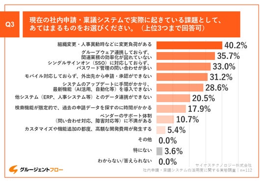 「Q3.現在の社内申請・稟議システムで実際に起きている課題として、あてはまるものをお選びください。(上位3つまで回答可)」(n=112)と質問したところ、「組織変更・人事異動時などに変更負荷がある」が40.2%、「グループウェア連携しておらず、関連業務の効率化が図れていない」が35.7%、「シングルサインオン(SSO)に対応しておらず、パスワード管理の問い合わせが多い」が33.0%という回答となりました。