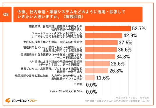 8. 今後の社内申請・稟議システムについて、52.7%が「経費精算、休暇申請、備品購入申請などの社内手続きへの適用拡大」を希望
