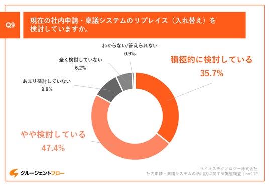 「Q9.現在の社内申請・稟議システムのリプレイス(入れ替え)を検討していますか。」(n=112)と質問したところ、「積極的に検討している」が35.7%、「やや検討している」が47.4%という回答となりました。