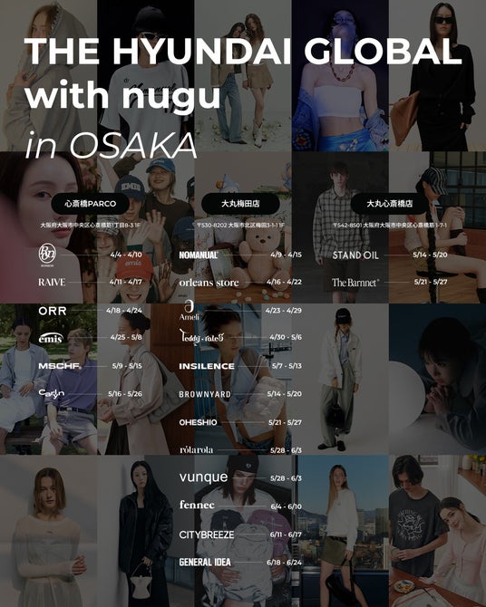 ファッションEC「nugu」は「現代(ヒュンダイ)百貨店」と連携し、大阪の心斎橋PARCO、梅田大丸(本館・E/S)、心斎橋大丸の3か所にて韓国人気ブランドを紹介するプロジェクト「THE HYUNDAI GLOBAL with nugu in OSAKA」を展開中です。