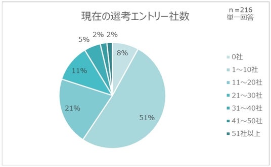現在の選考エントリー数は1~10社と回答した学生が51%と半数に上りました。11~20社と答えた学生は大幅に減少し、21%となり、21社~30社と答えた学生は11%と、~30社のエントリー数が83%という結果になりました。