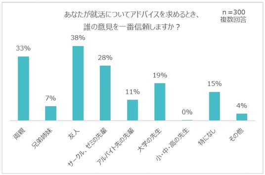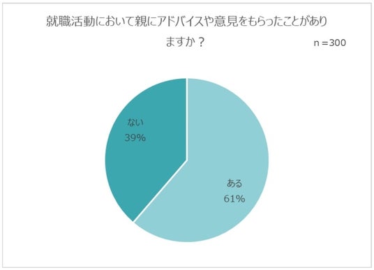 「あなたが就職活動についてアドバイスを求めるとき、誰の意見を一番信頼しますか?」という質問に対して、1位が友人の38%、2位が両親の33%、3位がサークル・ゼミの先輩の28%の回答となりました。必ずしも両親の意見を最優先に信頼するという結果にはなりませんでしたが、「就職活動において親にアドバイスや意見をもらったことがありますか?」という質問に対しては、61%があると回答し、学生にとって両親のアドバイスやサポートは心強いものであることが伺えます。