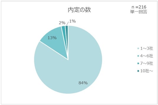 内定保持数については、1~3社が約8割と大多数となりました。その中でも一番割合が多かったのは内定数1社で約4割という結果となりました。4~6社の内定数となると回答数は減少し、13%となりました。