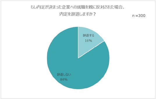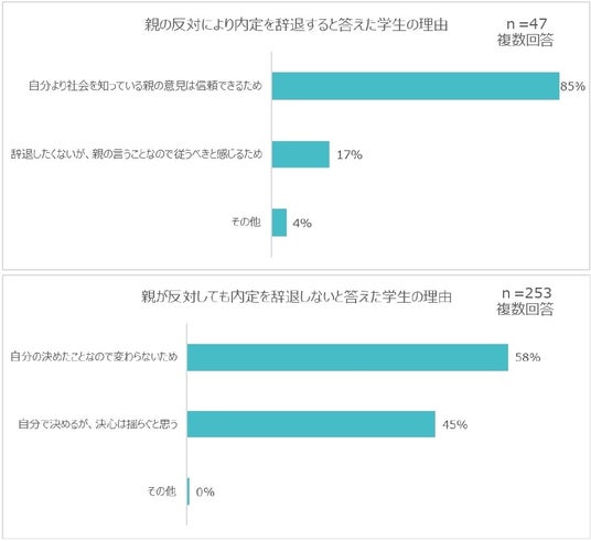 一方、企業が入社の意思を学生だけではなく両親にも事前確認する「オヤカク」についての質問に対しては、不要と答える学生が78%にも上りました。さらに、「もし内定が決まった企業への就職を親に反対された場合、内定を辞退しますか?」という質問に対しては、84%が辞退しないと回答しました。辞退すると回答した学生のうち、「辞退したくないが、親の言うことなので従うべきと感じるため」といった回答は17%と少なく、「自分より社会を知っている親の意見は信頼できるため」といった両親に対するポジティブな回答が85%となりました。辞退しないと答えた学生は、「自分の決めたことなので変わらないため」という回答が58%と半数以上が自身の考えを貫く傾向にありました。一方で、「自分で決めるが、決心は揺らぐと思う」という回答が45%となり、両親からの反対意見が学生にとって大きな影響があることが伺えます。