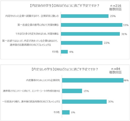 一方で、「一旦就職活動から離れ、連休後の就職活動再開のためにリフレッシュする」という回答が、内定ありの学生は22%、内定なしの学生は35%という結果になりました。GW中に鋭気を養う学生も一定の割合いることがわかりました。