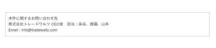 (注)「TradeWaltz」は日本国内における株式会社トレードワルツの登録商標です。その他の商品名、会社名、団体名は、各社の商標または登録商標です。