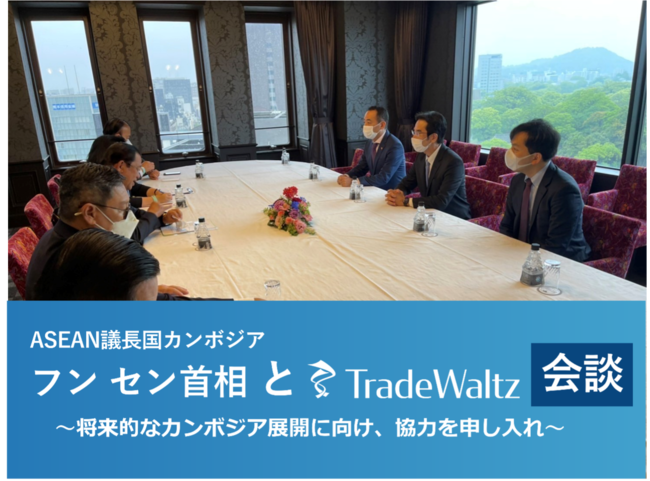 貿易情報連携プラットフォーム「TradeWaltz(R)」を運用する株式会社トレードワルツ(以下:トレードワルツ)は、将来的なカンボジアへのサービス展開に向け、4月23日(土)夕方、アジア・太平洋水サミット(熊本)に参加されていたASEAN議長国カンボジアのフンセン首相と面会致しました。