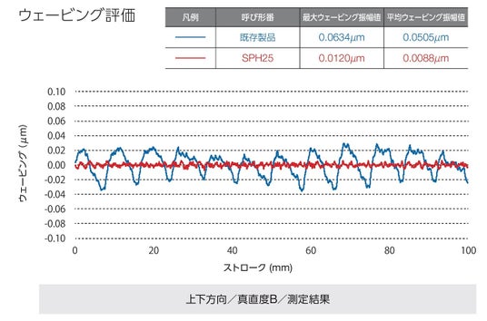 *ウェービングとは、LMブロックがLMレール上を移動する際に、内部のボール(転動体)が転がることでブロックとボールの相対位置が変化し、真直度に影響を及ぼす現象。特に高精度の加工装置では、ウェービングを極力小さくすることが求められている。