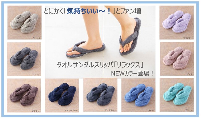 バスタイムから快眠まで、健やかで心地よいライフスタイルを提案する内野株式会社(本社:東京都中央区/代表取締役社長:内野信行)は、インフルエンサーにも愛用者の多いタオルサンダルスリッパ「リラックス」にNEWカラーが登場し、全9色展開で販売していることをお知らせいたします。