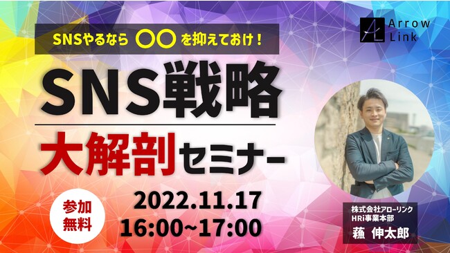 株式会社アローリンク(本社:兵庫県神戸市、代表取締役:蓬莱和真)は、11/17(木)にSNS採用実施企業様向けのオンラインセミナーを無料で開催します。「SNSやるなら〇〇を抑えておけ!SNS戦略大解剖セミナー!」と題し、コロナ禍に最適な"SNSを活用した採用戦略"について詳しくお伝えします。