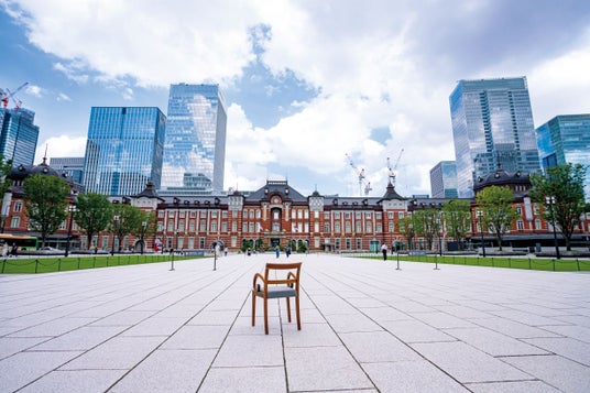 一脚のイタリア製のアイコニックな椅子を旅の友に、全国の名所で撮影を実施<写真は東京駅>