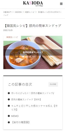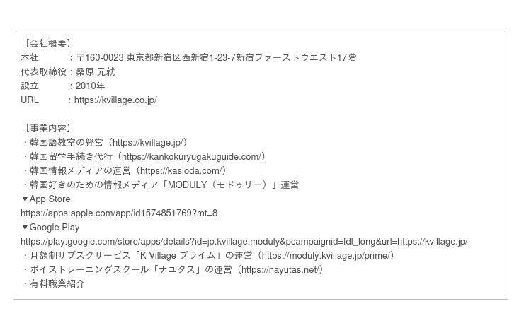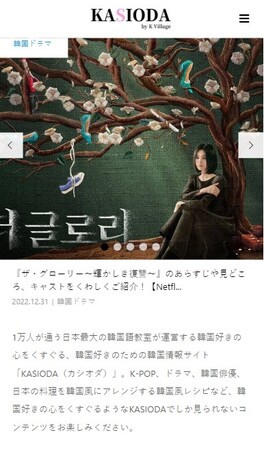 kasioda(https://kasioda.com/)は、K-POP、ドラマ、韓国俳優、日本の料理を韓国風にアレンジする韓国風レシピなど、韓国好きの心をくすぐるようなKASIODAでしか見られないコンテンツを発信しています。Instagramのフォロワー数は1万人、読者・視聴者の性別は男性が30%、女性が70%。年齢は10代~50代まで幅広い層から支持を得ています。弊社韓国語教室の生徒1万人も使っている自社アプリ「K Village MODULY」にもKASIODAの記事を掲載し、韓国情報を韓国好きに伝えられる仕組を設けています。