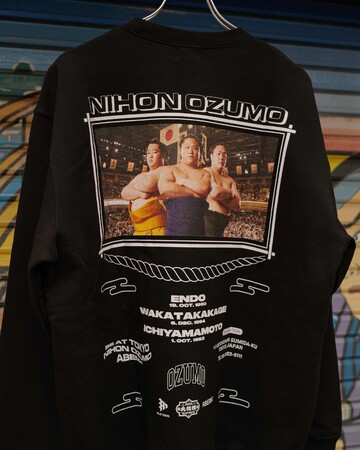 2022年11月13日(日)より発売するセカンドコレクションでは、スウェットを4型リリースいたします。今回も現横綱の照ノ富士、大関の正代や貴景勝、関脇の御嶽海のみならず、人気イケメン力士として有名な一山本、炎鵬、宇良などをモデルとして起用。前回好評だったラップTに引き続き、BE AT TOKYOらしいユーモアと、現役力士や大相撲へのリスペクト溢れるコラボレーションとなっています。