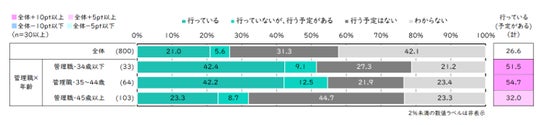 女性特有の健康問題に関する取り組みを「行っている」と回答した人は約2割(21.0%)で、「行っていないが、行う予定がある」(5.6%)を合わせても「行っている・または予定がある」は、3割未満(26.6%)となりました。管理職・年齢でみると、管理職の年齢が高いほど実施率が低く、45歳以上のいわゆる「ベテラン層」における「女性特有の健康問題」に関するリテラシーを高めることが全体的な実施率の向上に繋がりそうです。