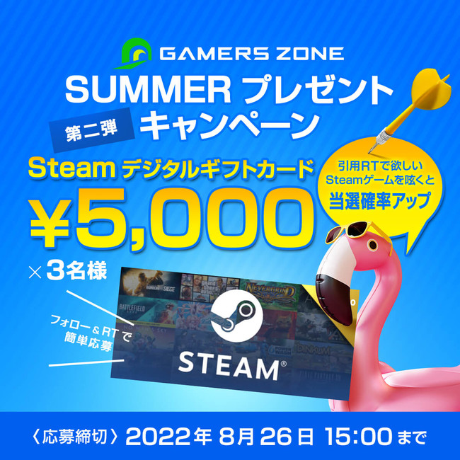 ソルフレア株式会社が運営するゲームメディア「GAMERS ZONE」(ゲーマーズゾーン)にて、PCゲームプラットフォーム「Steam」(スチーム)で使えるデジタルギフト5000円分が3名に当たるTwitterキャンペーン「GAMERS ZONE サマーキャンペーン」を開始します。応募期間は2022年8月19日(金)20:00より8月26日(金)15:00までとなっています。