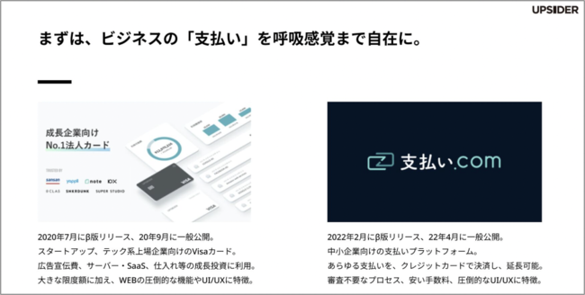 当社は、「挑戦者を支える世界的な金融プラットフォームを創る」をミッションに、法人カード「UPSIDER」およびビジネスあと払いサービス「支払い.com」を提供しており、両サービスの利用社数は5,000社を超えています。