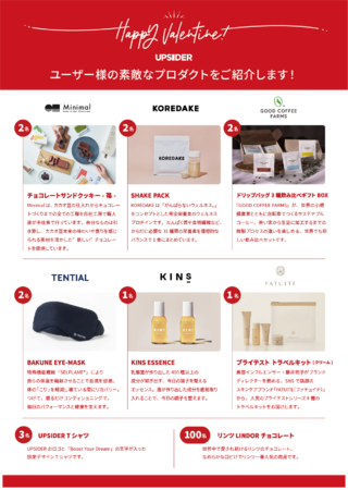 また、ブースでは、日頃からご利用いただいているユーザーの方々や、UPSIDERを応援してくださっている方々に感謝の気持ちを込め、”バレンタインプレゼントくじ”を実施します。100名以上の方にバレンタインのチョコレートや、ユーザーの方々の素敵なプロダクトが当たるチャンスなので、ぜひ会場ではブースに足を運んでみてください。