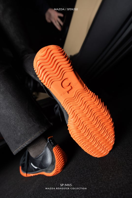 マツダとスピングルが手を組むことにより、自動車とシューズという異なる領域での価値融合を目指しました。どちらも広島生まれのメーカーであること、独自性の高いモノづくりを続けていることなど共通する点が多く、また、運転のしやすさからロードスターオーナーからもともとスピングルが支持されていることも背景の一つです。スピングルとしてもマツダの曲線美を追求したカーデザインに魅かれており、単一の車種として抜群の知名度と熱狂的なファンを持つマツダロードスターとのコラボが、ブランド力の向上につながるとしてオファーを快諾。まずはお互いの工場やミュージアム見学を通して、相互のモノづくりに対する想いや価値観を共有し、理解を深めるところから企画がスタートしました。両社によるミーティング、試作、修正を複数回重ね、足掛け2年の歳月をかけてお互いに納得のいくコラボスニーカーが完成しました。