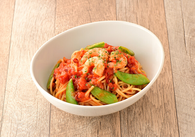 フードメニュー「パスタ 海老とスナップえんどうのピリ辛トマトソース」は、トマトの爽やかな酸味が特長のトマトソースに、輪切りの唐辛子を加えたピリ辛な味わいのパスタです。ぷりぷりの海老や春野菜のスナップえんどうをあわせた季節のパスタです。