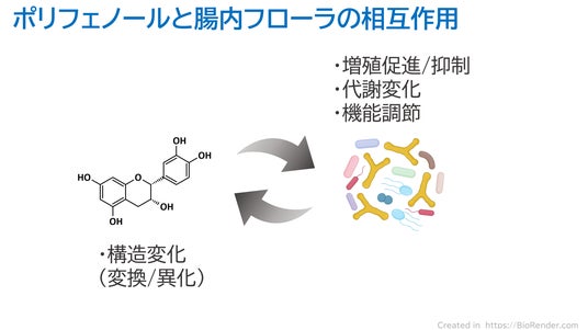 食事から摂取されたポリフェノールのうち、小腸で吸収されるのは全体の約10%ほどであり、残りの90%は大腸の腸内フローラ(腸内細菌叢)で作用しているのではないかということが、世界的にも注目されている研究テーマとなっています。