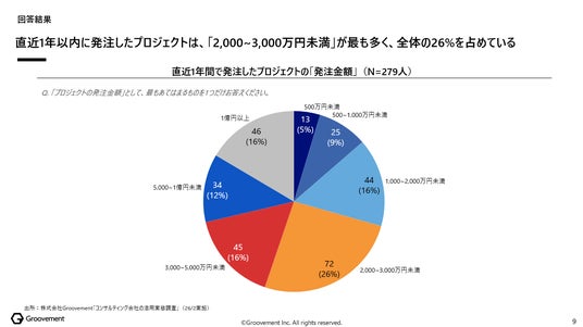 直近1年以内にコンサルティング会社に発注した金額は、2025年7月実施の前回調査と同じく「2,000万円~3,000万円未満」(26%)が最も多いボリュームゾーンでした。