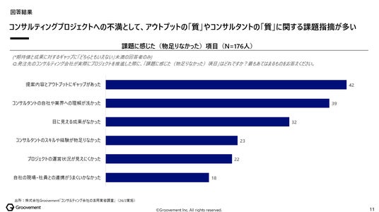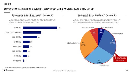 発注側は高額な費用に見合う高度なアウトプットを期待していますが、実際には「提案内容とアウトプットにギャップがあった」「コンサルタントの自社や業界への理解が浅かった」「目に見える成果がなかった」といった質の乖離が満足度を下げている実態があります。