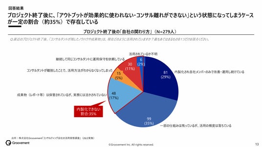 - 満足度が上がらない背景として、プロジェクト終了後のアウトプット活用について、「自社メンバーのみで改善・運用し続けている」と回答した企業は29%にとどまる。一方プロジェクト終了後に、「アウトプットが効果的に使われない・コンサル離れができない」とみられるケースも35%程度存在。